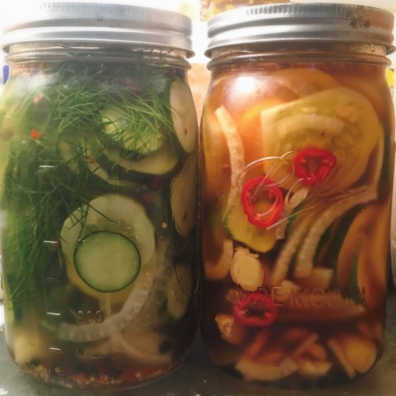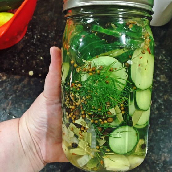 3. Slice up the cucumbers however you like. Or you can leave then whole, but I would maybe poke some holes in them if they’re very big to make sure the brine penetrates all the way into them. Put the cucumbers in your container, then pour the brine over everything (the recipe makes more brine than you’ll probably need, but you can always throw some more vinegar and water on top if you need to). Maybe give it a thump or two on the counter to get out any air bubbles.