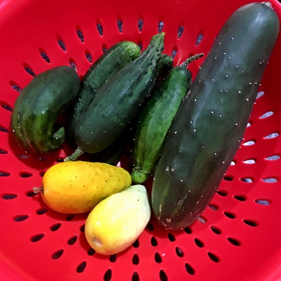 We actually harvested enough cucumbers from our tiny container garden to make two batches of pickles! I made one batch that was your basic garlic dill, and one batch inspired by Asian-style cucumber salads. The method was the same for both, so I’m going to go through that first, then give you the ingredients. If you’re not growing your own cukes, it’s worth it to get some from your local farmers market while they’re in season.