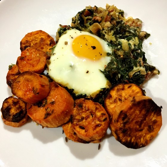 Quick Bite Posted on October 1, 2019 by peaseblossom101 Eggs baked in creamed spinach and chard, with roasted sweet potatoes (from this salad recipe, via Saveur) Share this: Click to share on X (Opens in new window) X Click to share on Facebook (Opens in new window) Facebook Like Loading...
